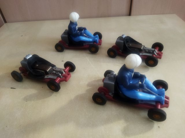 Modelos antiguos de Scalextric en miniatura. Son de color rojo oscuro y azul, con detalles en gris y blanco. Incluyen cuatro figuras de pilotos. Ideales para coleccionistas o para jugar. - Cuatro karts de Scalextric. - Diseño clásico. - Figuras de pilotos incluidas. - Perfecto estado.