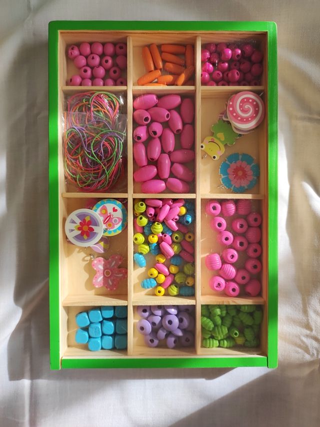 caja madera, tapa plástico, abalorios madera y cordones encerados.