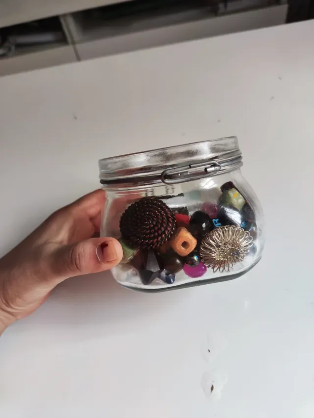 variedad de abalorios y adornos. - Abalorios de diferentes formas, tamaños y colores. - Adornos metálicos y de madera. - Cierre de clip metálico.