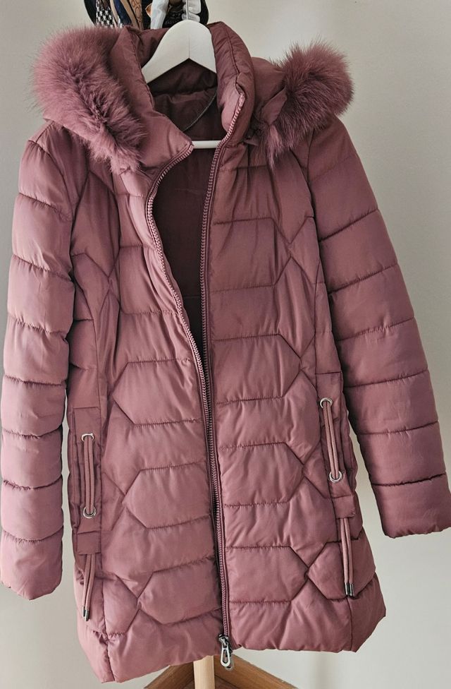 Abrigo acolchado color rosa empolvado. Capucha pelo suave. Talla M da para una 40-42. Tienda Hug&Clau.