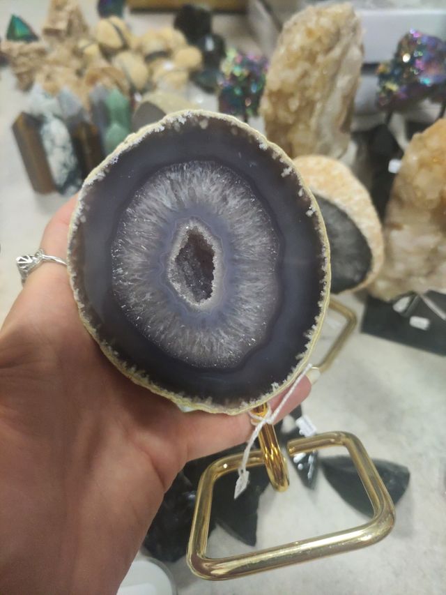 Preciosa ágata geoda con una base de metal dorada. Es una pieza única y llamativa. - Ideal para decoración o colección. Precio por unidad