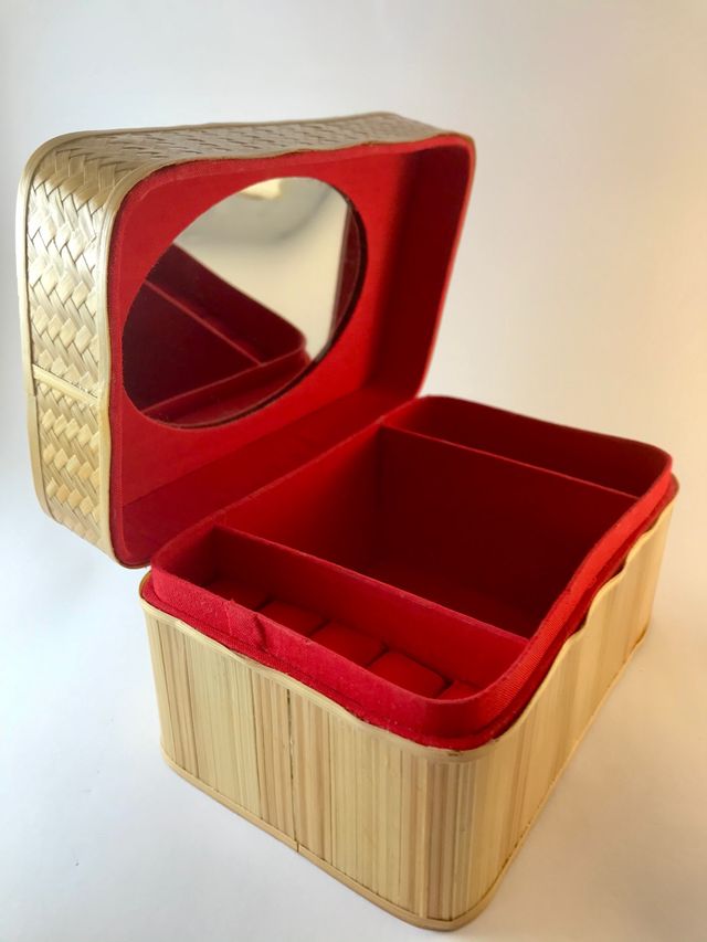 Détails du produitBonito y elegante joyero chino vintage de madera y bambú con espejo integrado.