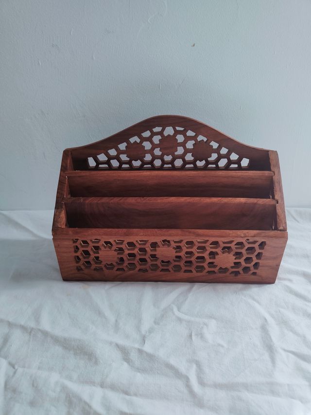 Détails du produitBonito, antiguo y gran lapicero, portalápices, organizador de cartas, material de dibujo y mandos de gran tamaño. De madera de Teka tallada y bonito diseño emulando flores y enrejado. Artesanal, artesanía hecha a mano. Con 3 apartados. Gran peso.