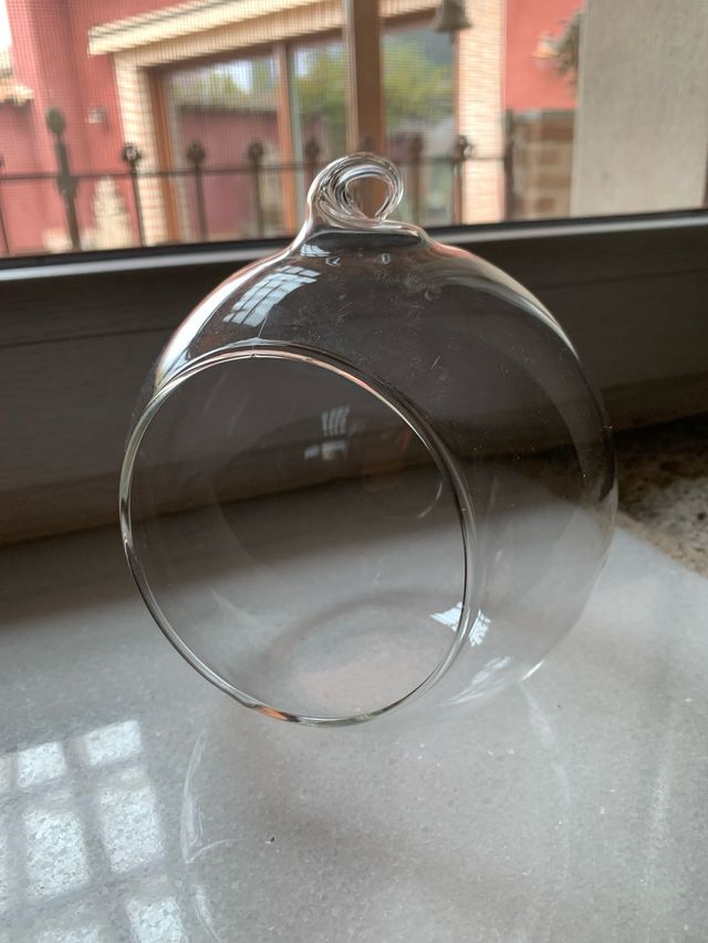 De cristal, con un acceso grande para meter cosas de decoración, velas, etc.