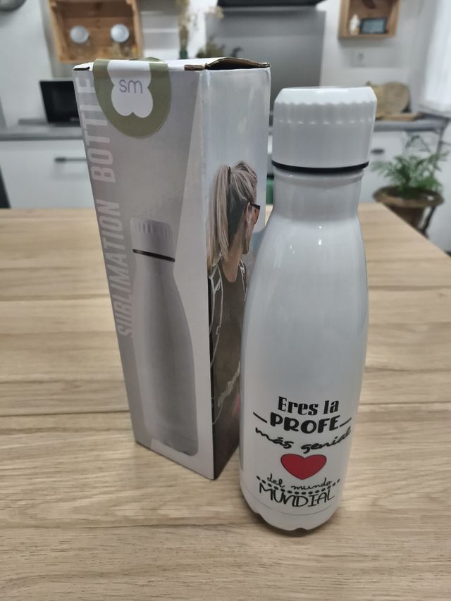 Détails du produitBotella térmica de acero inoxidable, ideal para regalar a una profesora. Es blanca y tiene una frase impresa: "Eres la profe más genial del mundo". - Nueva, sin usar. - Perfecta para mantener bebidas frías o calientes. - Diseño elegante y moderno. Mesures du produit