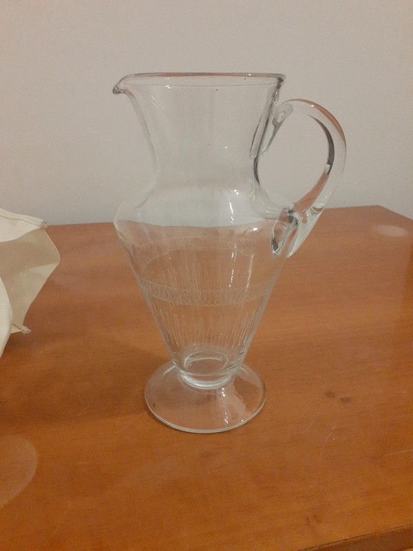 Brocca che faceva parte di un servizio degli anni '60. Perfettamente integra. Decorazione incisa. Misure massime cm 24x17. Apertura diametro cm 10