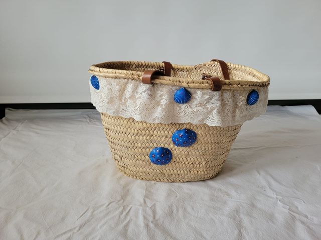 Capazo de mimbre decorado con puntas y conchas pintadas a mano, ideal para el verano. Medidas: 41 cm de ancho, 26'5 cm de alto.