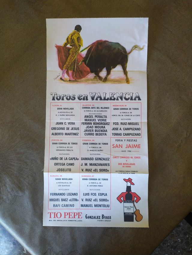 Détails du produitCartel para enmarcar de exposición de corridas de Toros Feria San Jaime en Plaza de Valencia año 1986. Obsequio exclusivo de Bodegas Gonzalez Byass a directiva invitando a visita, en papel de calidad y seda por la parte principal, atras escudo e invitación en 3 idiomas.