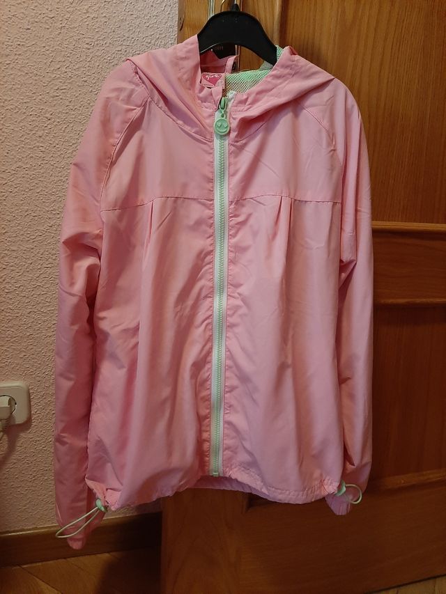 Cazadora tipo chubasquero rosa, adornos en verde, muy ligera, usada 1 vez. Mejor ver