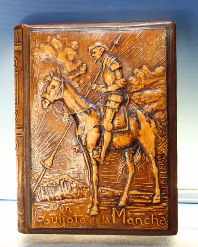 Cigarrera, caja para cigarros, puros cuero repujado con relieve de Don Quijote.