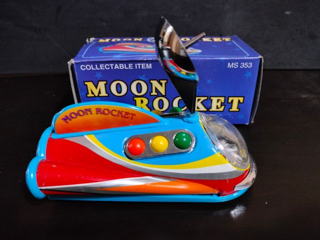 Détails du produitPrecioso cohete o vehículo de exploración lunar, con múltiples detalles como un astronauta conductor y una lámpara exterior simulada. Tracción en ruedas traseras, se impulsa hacia atrás y después se suelta para moverse. Estilo vintage, de plástico. Es muy bonito, más bien para coleccionarlo o exponerlo en vitrina, pero también como juguete para los peques. Se incluye su caja original con pequeñas marcas de almacenamiento. Mide: 13 cm. de largo, 7 cm. de alto y 6 cm. de ancho. Excelente estado, sin usar. Mesures du produit