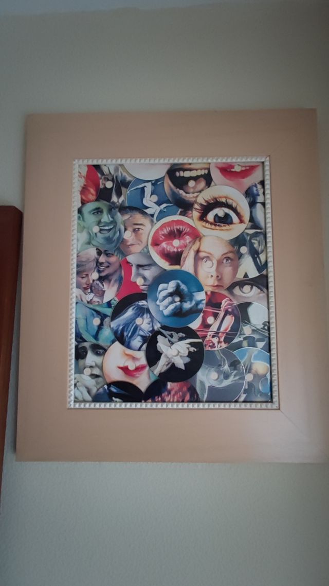 Cuadro vanguardista realizado con CDs sobre marco de madera. 71x61