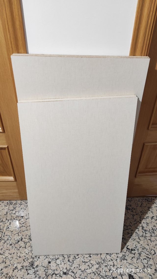 Détails du produitTablones cortados de aglomerado de 2 cm de grosor, color blanco gris tacto efecto tela y canto biselado por un lateral.