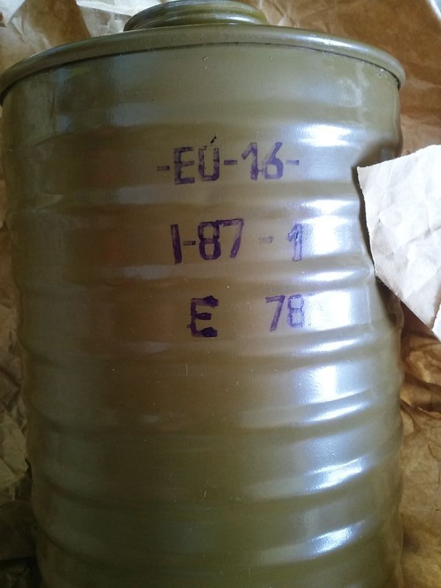 Détails du produitCartucho de filtro E0-16 de 40 mm para máscaras de gas soviética ShM-41 , ShMS y MM-1 introducido en la década de 1960. Este filtro fue producido en el año 1978 como se aprecia en la imagen por el número "78". A menudo este filtro se le denominaba "lata de café" debido a su forma cilíndrica.