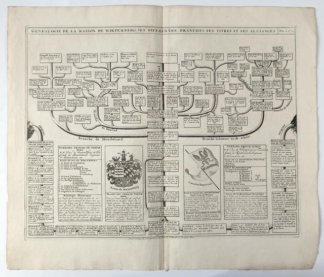 'Genealogie de la Maison de Wirtemberg, ses diferentes branches, ses titres et ses alliances'. Genealogía de la Casa de Wirtemberg, sus diferentes ramas, sus títulos y sus alianzas. Árbol genealógico de la línea alemana Wirttemberg, o Württemberg. Grabado original de Henri Abraham Chatelain (1684-1743) procedente del tomo II del Atlas Historique Ou Nouvelle Introduccion a L'Histoire de 1708. Muy buen estado, pliegue central de la encuadernación. Artículo ORIGINAL de 1708. Medidas: 52,5 x 45 cm