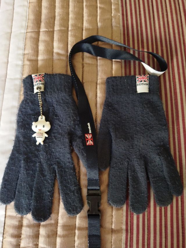 Détails du produitGuantes de lana,azul marino, unisex,con logo y muñeco Reebok.Lleva cordón para colgar en el cuello y no perderlos.Talla pequeña, chicos o chicas de 14 a 16 años.