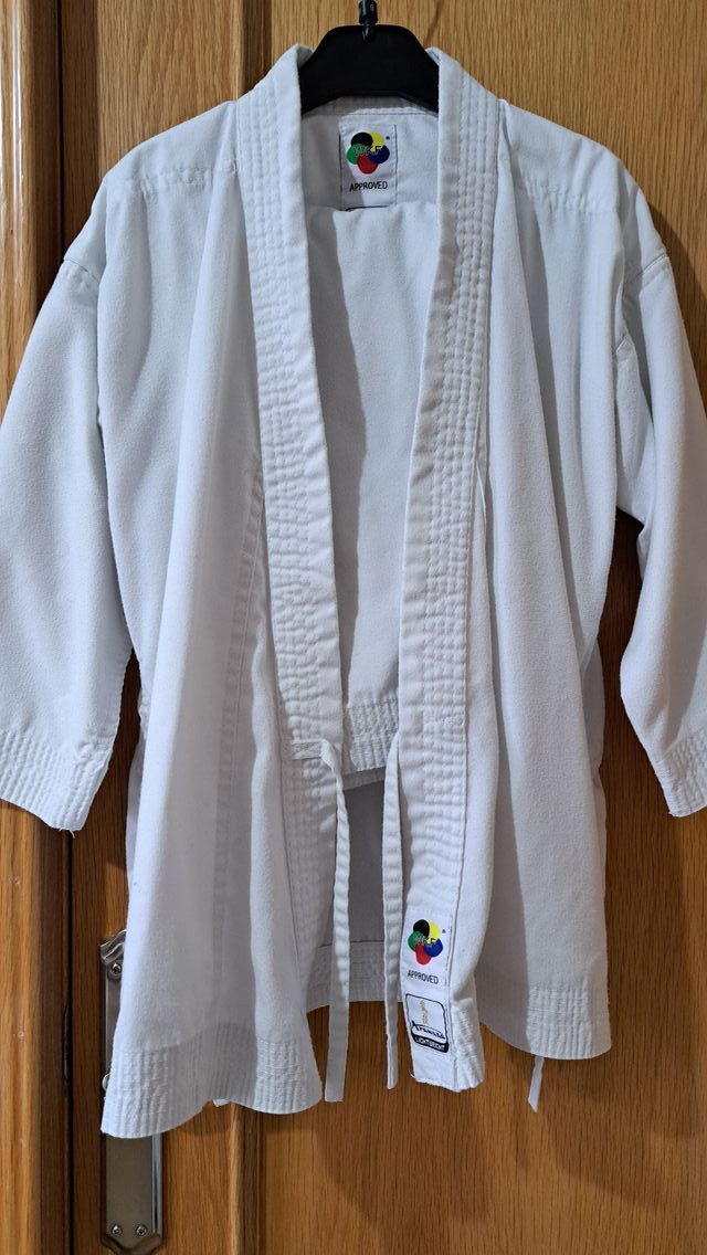 Karategui Arawaza LightWeight aprobado por la WKF. Talla 1,30 La chaqueta está en perfecto estado. El pantalón tiene una rodilla un poco marcada de azul.