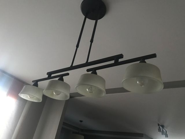 De forja y cristal, regulable en altura y se giran las tulipas para cambiar su forma. Las tulipas pueden quedar enfrentadas