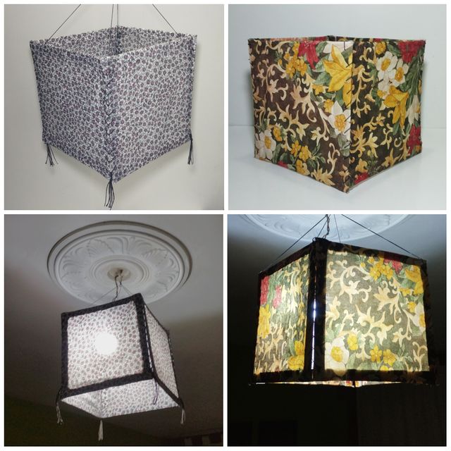 Détails du produitDos lámparas de techo de tela estampada, una con estampado de flores pequeñas sobre fondo blanco y la otra con flores y arabescos estilo antiguo de 25x 26 cm. Cada lámpara a 6€ Mesures du produit
