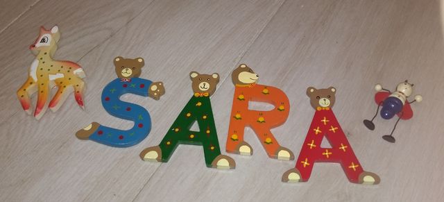 Détails du produitLetras de madera con la composición del nombre " SARA" para decorar puertas, cuadros o personalizar dormitorios.Se compone de 4 letras y dos figuras,medidas 10 cm por 8cm aproximadamente.Han estado pegadas en un cuadro.