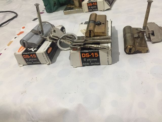 Détails du produitLote de 3cerraduras para puertas blindadas,una de las cerraduras tiene 5 llaves,la otra tiene 3 llaves y la tercera 3 llaves dos van con caja y una sin caja son cerraduras originales vendo el lote de 3 cerraduras por 45€.