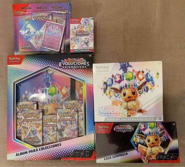 Détails du produitLote de blisters y cajas de cartas Pokemon de la colección Evoluciones Prismáticas, en castellano. Todo totalmente cerrado y precintado, directamente de tienda, sin sufrir ningún rasguño.