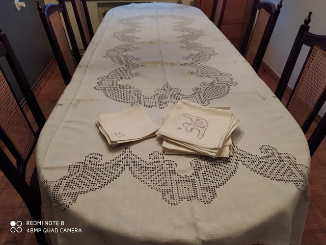 Mantel de hilo hecho a mano lagartera abierta. Junto con el mantel se incluyen las servilletas. Mide 2,65m de largo y 1,56m de ancho. Tiene alguna mancha.