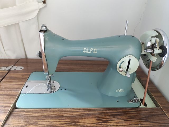 Maquina de coser con pedal, marca Alfa, con mueble de madera, en perfecto estado.