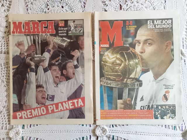 Détails du produitLote Diario Periódico Marca Real Madrid Campeón Intercontinental 1998 2002. Muy bien conservados, sin doblar, sólo las las dos últimas hojas del de 2002 algo dobladas por arriba