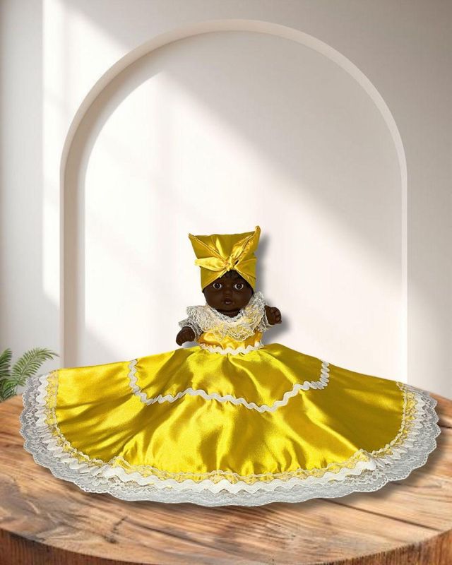 Détails du produitPreciosa muñeca vestida con un hermoso traje amarillo. Ideal para coleccionistas o amantes de la cultura yoruba.