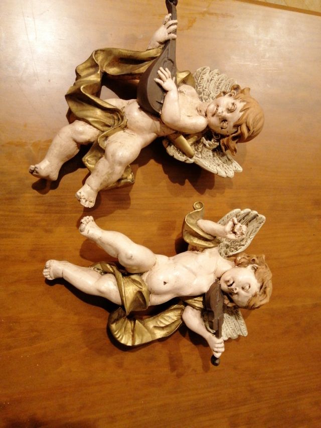 Pareja de angelitos pintados a mano de 26 x 15 de ancho, con enganche para colgar. Uno de ellos tiene un desperfecto en el paño que le cubre la pierna.