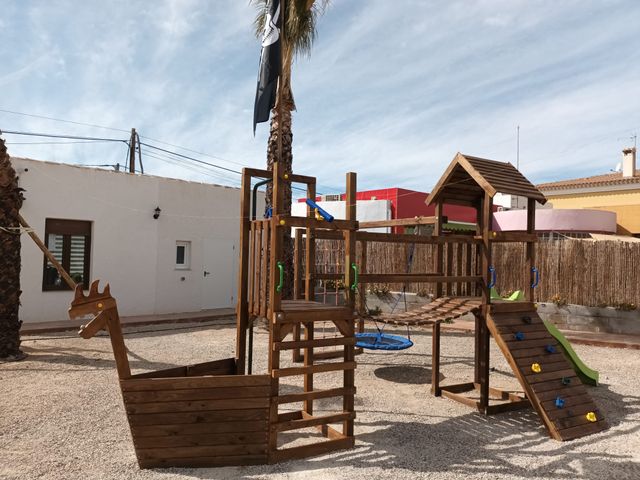 Détails du produitParque infantil de madera maciza, pino tratado, autoclave. Fabricación artesanal y de calidad. INSTALAMOS en tu jardín. *Columpio nido de 0,80 m de diámetro. *Tobogán, *Arenero, *Proa de barco, *Barra de bomberos *2 Torres de 0,8 x 0,8 m con tejado de 2 aguas, *Plataforma del tobogán 1,2 m (alto), *Timón, *Telescopio, *Bandera pirata. Dimensiones que ocupa el parque: 7 (largo) x 4 (ancho) x 2,8 (alto) m. Postes de 9 x 9 cm, tablas de 2,1 x 9 cm. Tenemos otros modelos de parques infantiles. Fabricamos cualquier modelo de parque a medida. Entregamos e instalamos en toda España. TELÉFONO: 689152891 Silvio