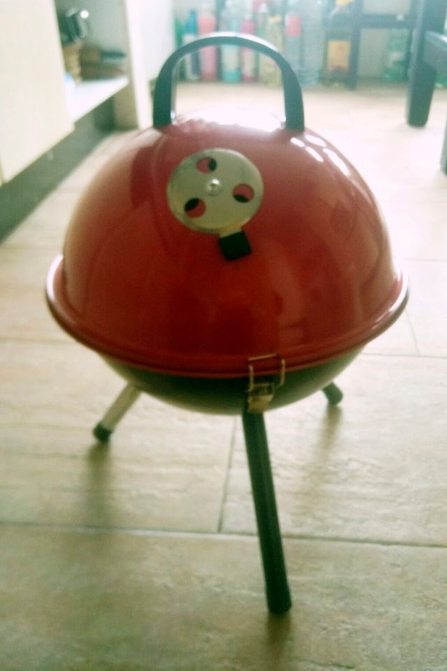 Pequeña parrilla redonda con tapa, portatil, de sobremesa con tres patas.
