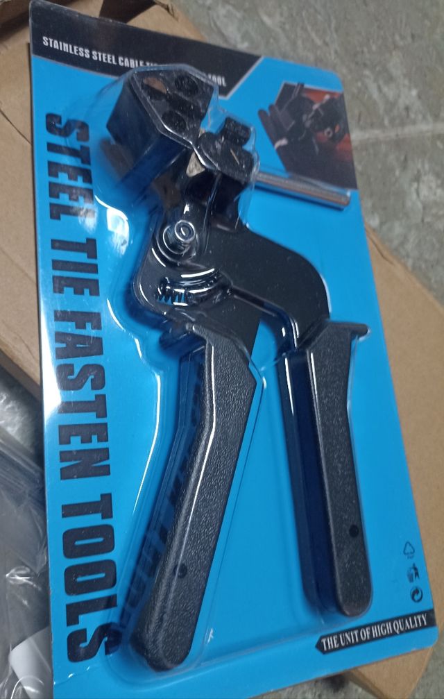 Alicates para tensar y cortar BRIDAS ACERO INOXIDABLE. Incluye paquete de 100 bridas acero inoxidable: 4.6 x 450 mm. Resistencia de brida hasta 80 Kg.