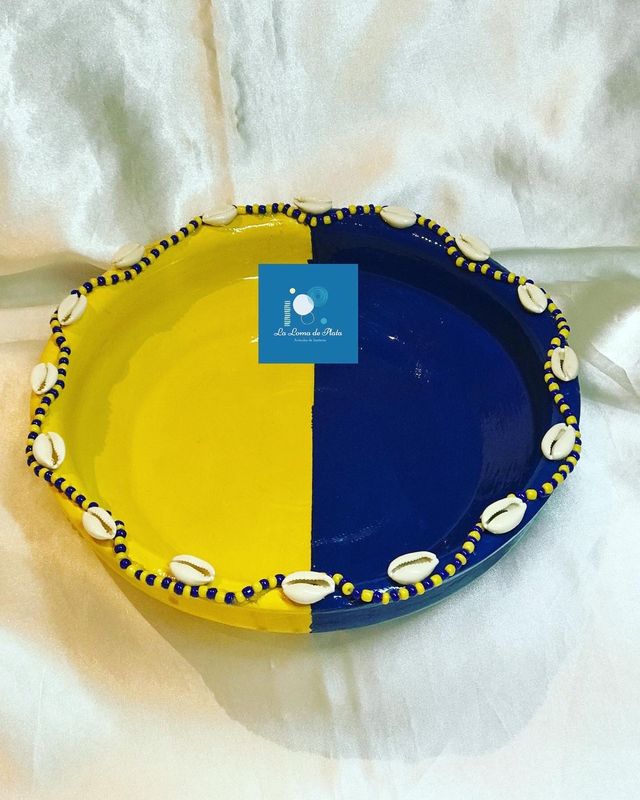 Plato de Oshosi de barro pintado en azul y amarillo con detalles en cuentas del mismo color y cauris.