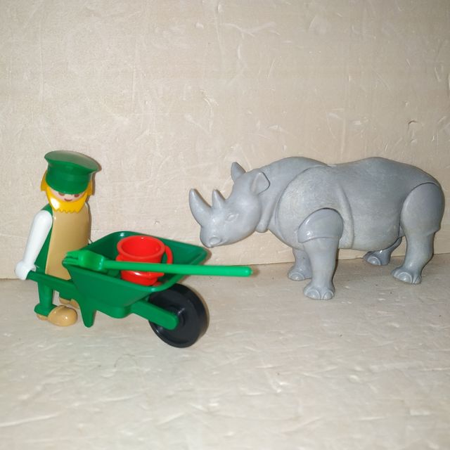 Détails du produitNo negociable, caja 8. Playmobil de cuidador con carretilla y un rinoceronte. El cuidador tiene un gorro verde y un delantal marrón. La carretilla es verde y contiene una regadera roja. El rinoceronte es de color gris. - Incluye una figura de cuidador.