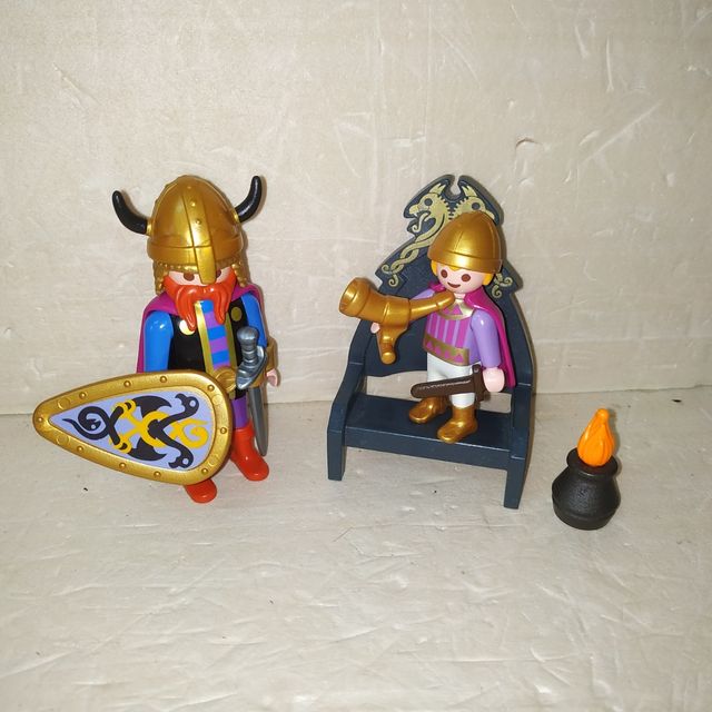 Détails du produitNo negociable, caja 8. Set PLAYMOBIL de vikingos, en buen estado. Incluye dos figuras: un rey vikingo con armadura dorada y un príncipe. También se incluye un trono, un escudo, una espada, un pequeño brasero y un cuerno. ¡Perfecto para completar tu colección!