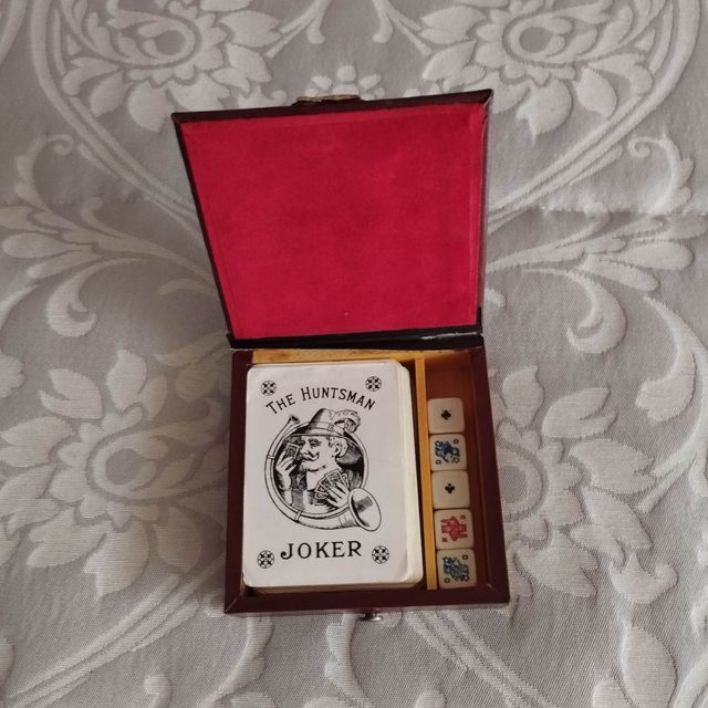 Estuche de póker marrón, imitación piel. Contiene cartas y dados. Mide 10×10×2 cm.