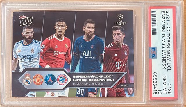 Détails du produitPSA 10 Topps Now 136: Lionel Messi, Cristiano Ronaldo, Karim Benzema, Robert Lewandowski: Benzema joins the 80 club.