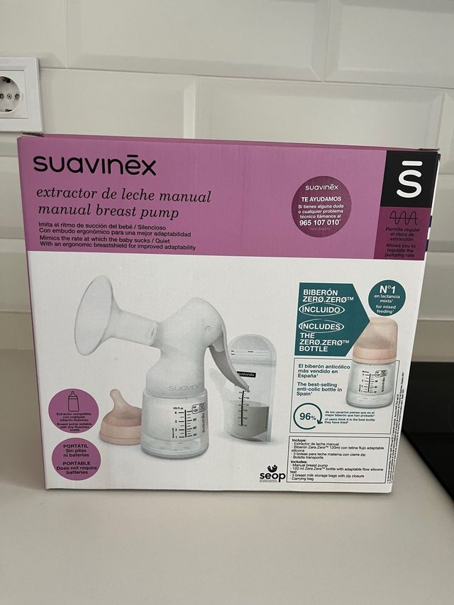 Incluye extractor manual, biberon anticolicos con tetita de flujo adaptable y bolsas de almacenamiento para la leche