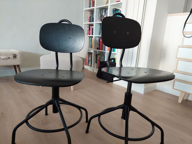 Détails du produitSilla de escritorio Ikea. De madera color negro. Sin ruedas. Con mecanismo para subir y bajar el asiento. Giratoria.
