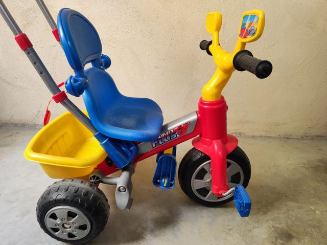 triciclo infantil, con soporte para pies abatible, carrito trasero y barras dirección para el adulto, con soporte para botellita de agua, artículo muy bien cuidado