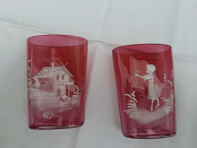 Détails du produitConjunto de dos vasos de cristal de color rosa intenso, con un diseño grabado de Mary Gregory pintado a mano con estilo victoriano. Cada vaso presenta una escena diferente.